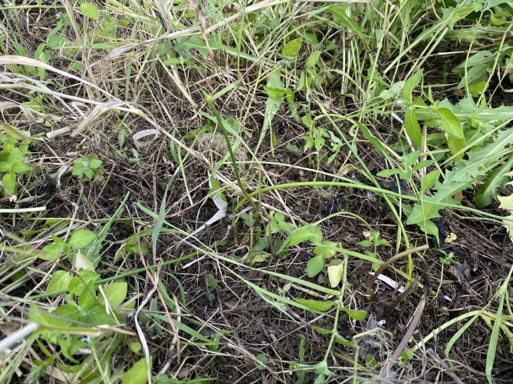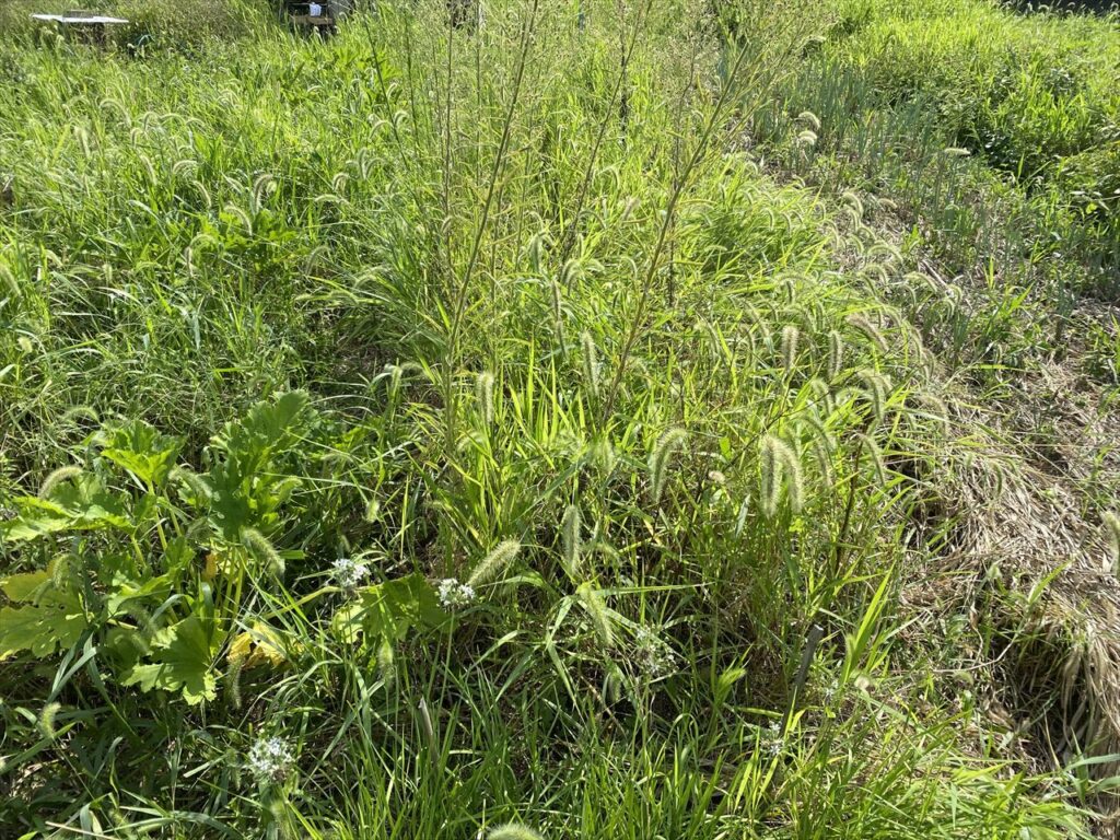 この草ぼうぼうの畝は、去年に植え付けたらっきょうが植わっています。