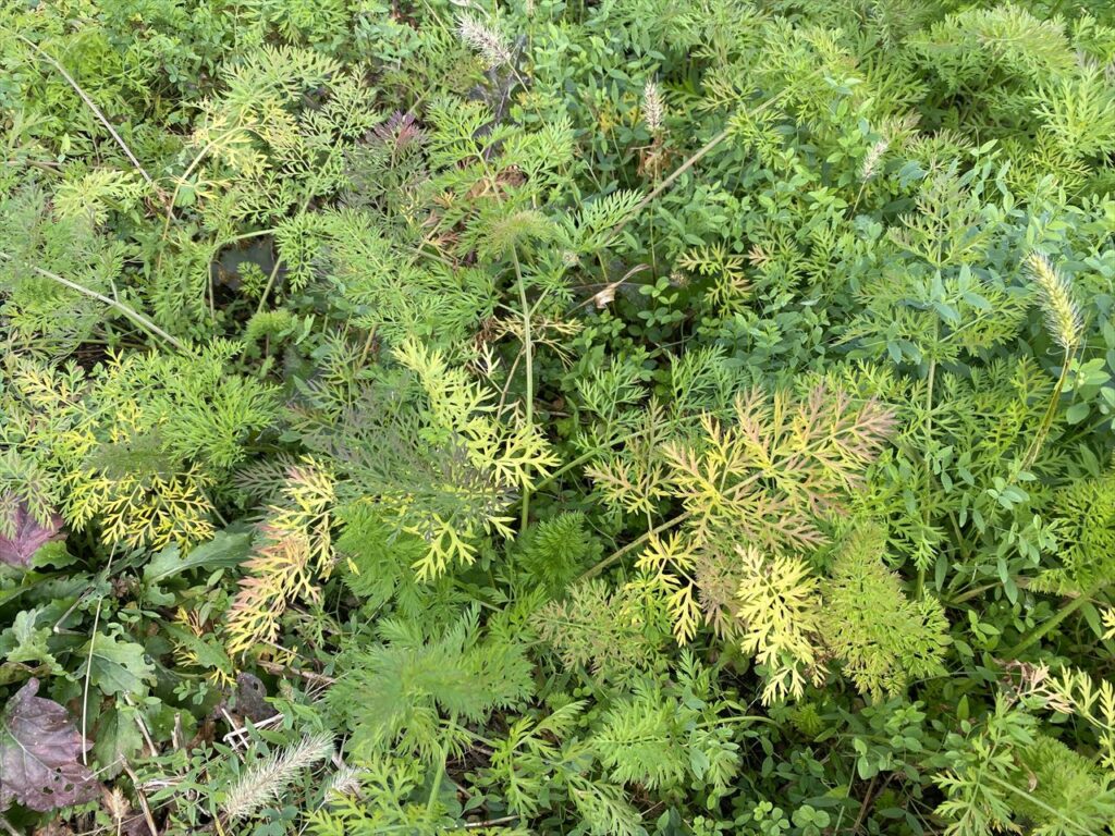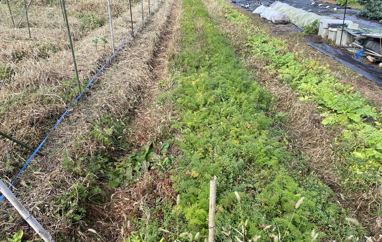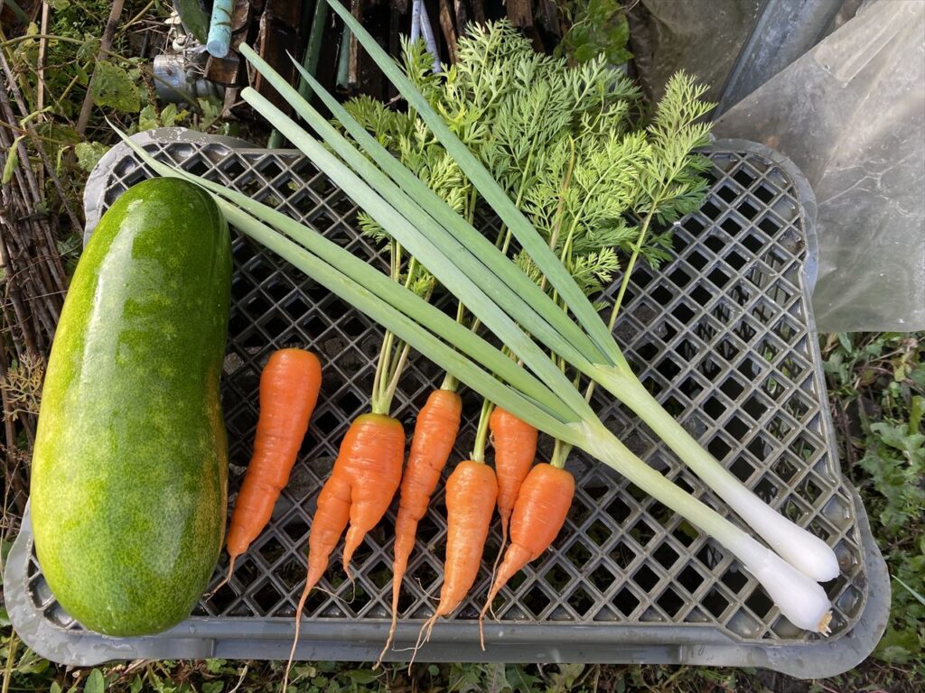 スポンサーリンク 人参も紅葉か? ウリ類 2025.11.26 11月26日最近の朝の低温の影響かわかりませんが、人参の葉っぱも色づいてきました。 こんな感じ・・・まだまだ小さい人参もあるのに色づくと成長が止まるのではないかと心配です。 今日の収穫です。人参は、黒田五寸人参なのにまだ2寸や3寸止まりがレギュラーです。早く大きくなってほしいなあ・・・今年最後の冬瓜。冬瓜は、保存できるので大変重宝しています。