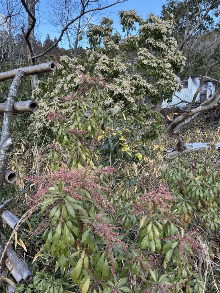 スポンサーリンク 蜂場の蝋梅と馬酔木 花 2026.01.06 1月6日蜂場の蝋梅が例年通り咲き出しました。 いい香りです。 山の蜂場の馬酔木も咲き出しました。この蜂場には、たくさん馬酔木がありますが、咲いているのはこの1本だけですが・・・ 他の馬酔木は、この写真の手前のようにまだ蕾です。 花は咲いたけど、冬は、これからが本番。早く暖かくなってほしい・・・